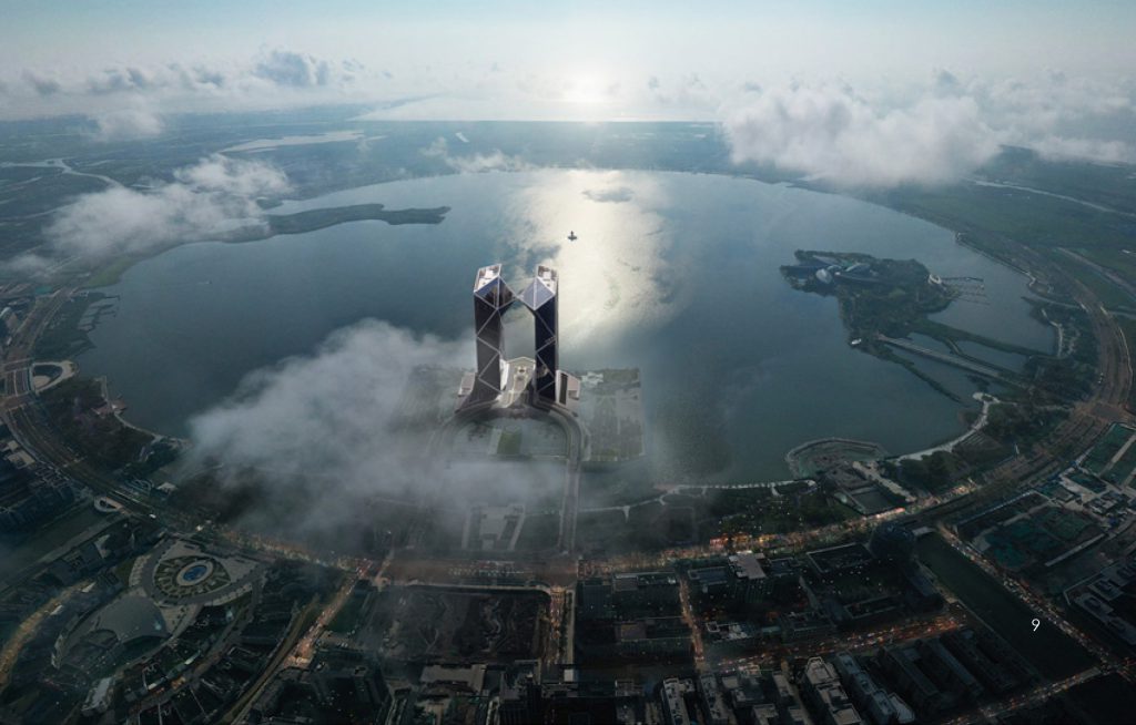 Dwie smukłe wieże są centralnym punktem wielkiego bulwaru, z którego rozpościera się panorama na centralne jezioro w sercu Strefy Wolnego Handlu i ocean. Symetryczne wieże zostały oddzielone napiętą pionową pustką, ale połączone wspólnym podium.