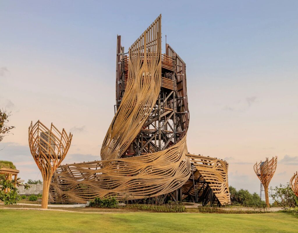 Wieża Tri Hita Karana Tower wykonana została z rattanu i drewna żelaznego. Nowy obiekt znajduje się na szczycie czarnej piaszczystej plaży Nyanyi w kurorcie Nuanu City. Inspiracją przy projektowaniu 30-metrowej wieży był naturalny krajobraz regionu, jako płótno dla interaktywnej instalacji sztuki sztucznej inteligencji (AI).