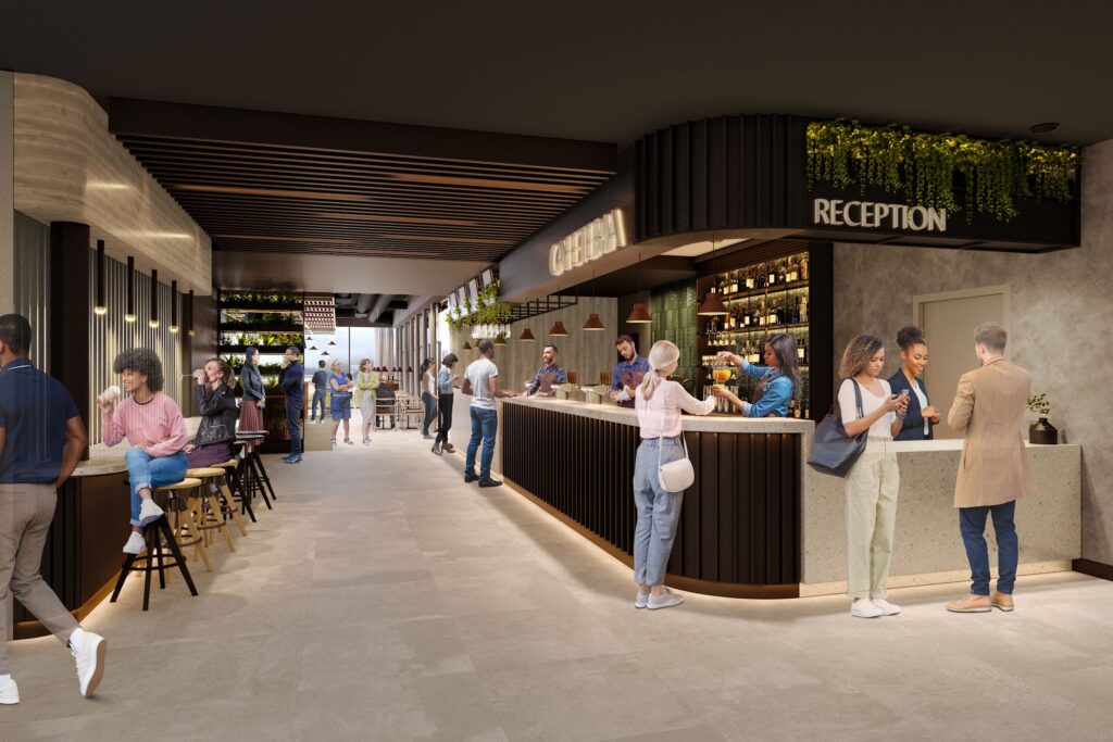 Rdzawe wykończenia podstawy stołów przywołują naturalne procesy erozji i starzenia się materiałów wnosząc do przestrzeni ciepło i głębie, jednocześnie przypominając o nieujarzmionej sile natury. Jasne tkaniny, drewniane panele ścienne i beżowe wykończenia barów oraz podłóg dopełniają paletę kolorystyczną. Stoiska barowe, usytuowane wzdłuż korytarzy areny, wyróżniają się zielonymi, szkliwionymi płytkami, które fantastycznie grają ze światłem.