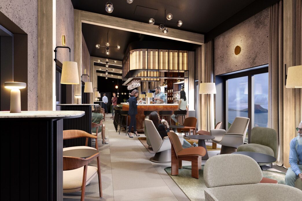 Iliard odpowiada za projekt wnętrz obejmujący kafeterię, strefę VIP lounge oraz bary. Inspiracją dla projektu jest odwołanie się do charakterystycznego krajobrazu wysp – falujących wzgórz, kamiennych klifów i rozległych trawiastych połaci, których kolory zmieniają się wraz z porami roku. Naszym celem było oddanie potęgi natury Wysp Owczych poprzez zastosowanie materiałów odzwierciedlających autentyczność i prostotę wyspiarskiego krajobrazu – mówi Paula Olszewska, Starsza Architekta Wnętrz. Zależało nam, aby połączyć współczesny minimalizm z pierwotnym pięknem lokalnego otoczenia. Właśnie dlatego wszystkie projektowane przestrzenie wykorzystują materiały, które podkreślają charakter lokalnego środowiska – dodaje Paula Olszewska.
