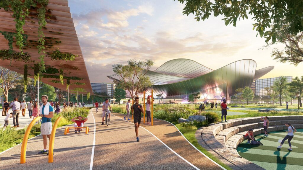 Nowe wizualizacje przedstawiają szczegółowe rozwiązania architektoniczne, w tym imponujące „centrum mobilności” – kilkupoziomową, drewnianą konstrukcję otoczoną torami transportowymi. W projekcie pojawiają się również futurystyczne pojazdy G2A (Ground to Air), zdolne poruszać się zarówno po specjalnych liniach kolejowych, jak i unosić nad ziemią. Kolejnym obiektem będzie „wioska sportowa”, zaplanowana w przestronnym, srebrzystym gmachu.