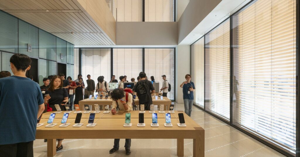 Nowa koncepcja Apple Ginza koncentruje się na naturalnym świetle i otwartej strukturze budynku. Każda kondygnacja ma dostęp do światła dziennego, a przemyślane otwory w stropach zapewniają wizualne połączenie między piętrami. Klienci mogą podziwiać panoramę Ginzy z balkonowych przestrzeni, a wewnątrz ciepłe drewniane wykończenia nadają wnętrzu przyjazny, harmonijny charakter.