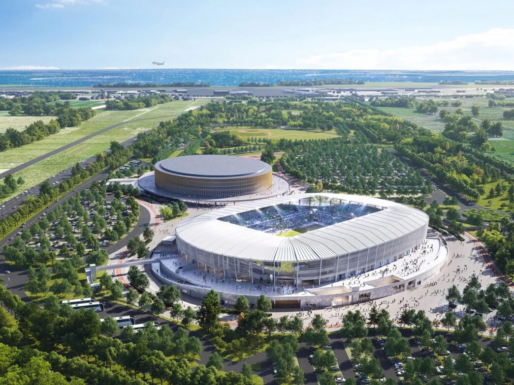 Podium w kształcie półksiężyca otacza główną bryłę stadionu i mieści parkingi oraz pomieszczenia usługowe, w pełni zintegrowane z konstrukcją. Trybuny rozłożone na trzech stronach – południowej, wschodniej i północnej – zapewniają doskonałą widoczność z każdego miejsca, a zwarta konfiguracja zbliża kibiców do boiska. Trybuna zachodnia, przeznaczona dla VIP-ów, będzie oferować panoramiczne widoki z zadaszonego holu oraz strefy rekreacyjne dla odwiedzających.