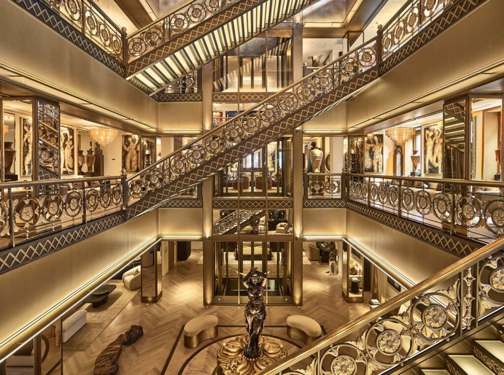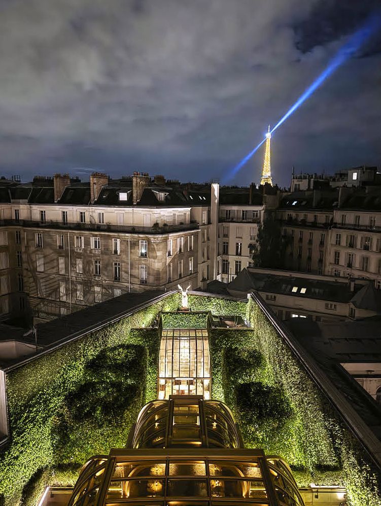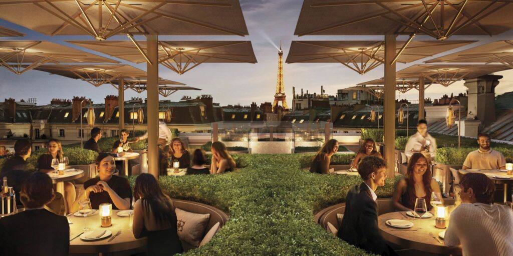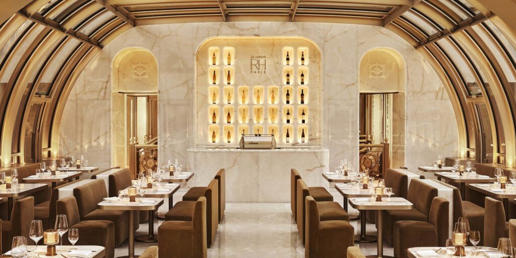 Nowa siedziba RH nie jest zwykłym punktem sprzedaży – to doświadczenie, które łączy architekturę, design i gościnność. Goście wchodzą do budynku przez kameralne wejście, ukryte wśród zieleni, prowadzące malowniczą ścieżką wokół obiektu. W środku czeka przestrzeń pełna światła i harmonii – restauracja z przeszklonym dachem przypomina oranżerię, a z górnego poziomu roztacza się widok na panoramę miasta i majestatyczną Wieżę Eiffla.
