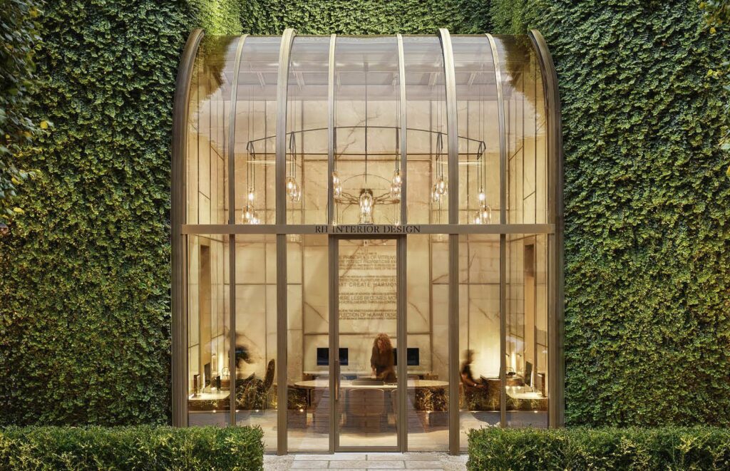 W tylnej części budynku znalazło się nowe studio projektowe RH – minimalistyczny pawilon ze szkła, który dopełnia architektoniczny charakter całości.