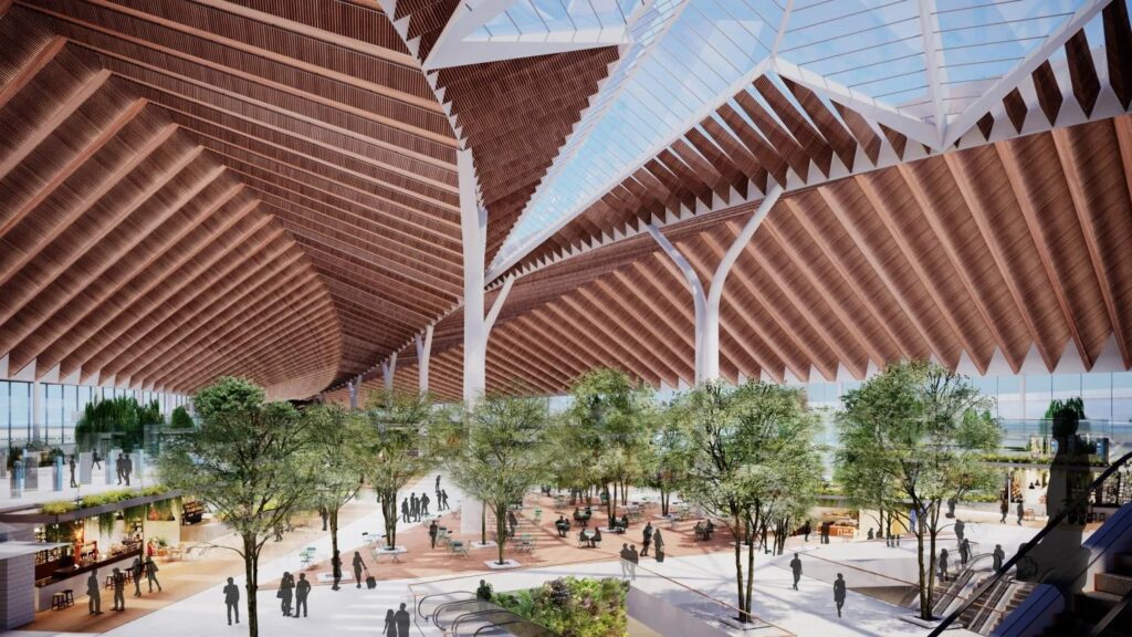 Konstrukcję dachu wspierają kolumny w kształcie litery Y, rozmieszczone co ponad 30 metrów, co pozwala zachować otwartość przestrzeni oraz elastyczność adaptacyjną w perspektywie lat. Pod Oculusem rozciąga się Central Green – przestrzeń publiczna z zielenią, miejscami siedzącymi oraz obszarami do organizacji wydarzeń, tworząca przyjazne otoczenie dla podróżnych. Trzy odnóża terminala otaczają bulwary handlowe, restauracje i punkty usługowe, przypominając uliczną zabudowę miasta.