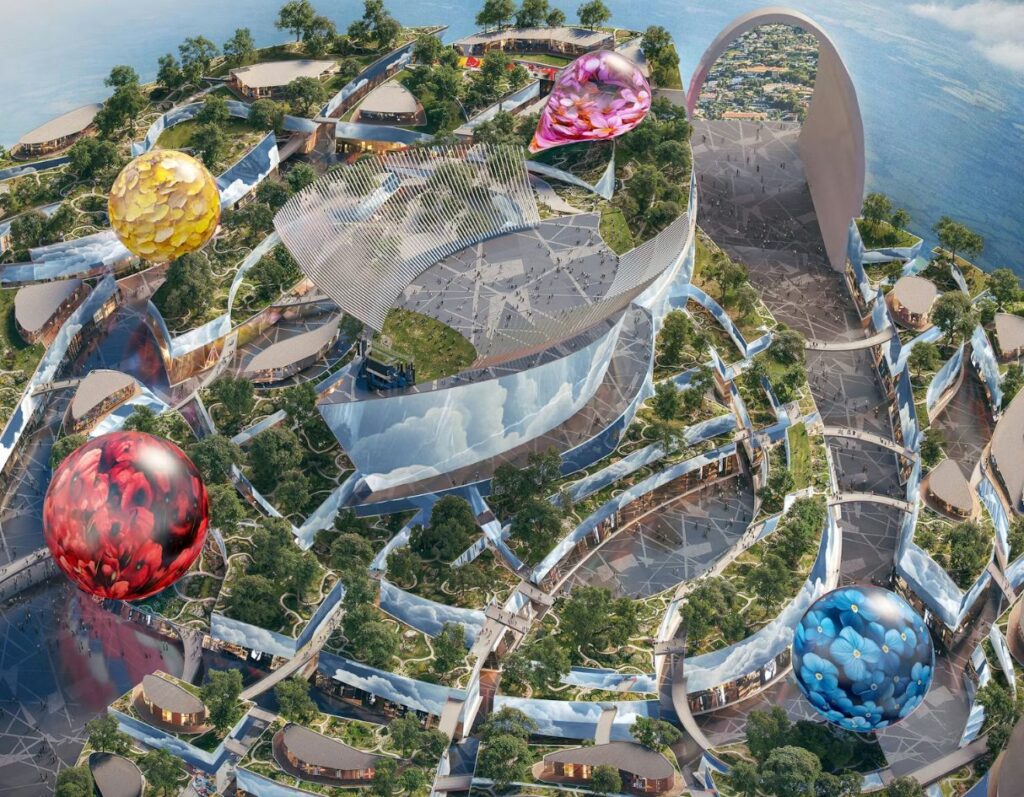 Centralnym elementem koncepcji jest obiekt o wysokości około 350 metrów, zaprojektowany w formie monumentalnej kuli. Budowla ta pełni funkcję łącznika pomiędzy fizyczną strukturą miasta a środowiskiem cyfrowym. W założeniu ma być miejscem testowania nowych technologii, platformą edukacyjną oraz przestrzenią immersyjnych doświadczeń narracyjnych, integrujących świat realny z wirtualnym.