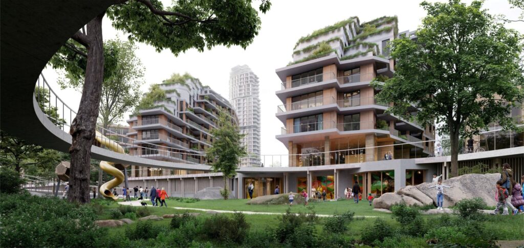 Jednym z kluczowych komponentów projektu jest rewitalizacja pobliskiego parku leśnego, realizowana we współpracy z miastem oraz partnerami inwestycyjnymi JTRE i Penta Real Estate. Plan obejmuje utworzenie otwartych przestrzeni rekreacyjnych, punktów widokowych nad rzeką oraz miejsc wypoczynku.